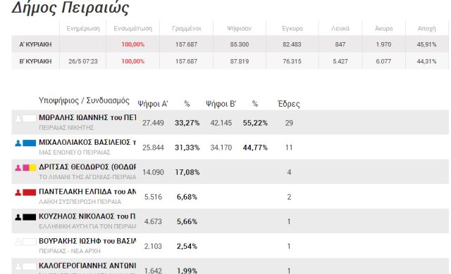Στο 55,22% διαμορφώνεται το ποσοστό που συγκέντρωσε ο νέος δήμαρχος Πειραιά, Γιάννης Μώραλης, με καταμετρημένο το σύνολο των ψήφων.