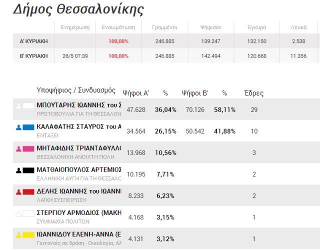 Στο 58,11% διαμορφώνεται το ποσοστό που συγκέντρωσε ο επανεκλεγείς δήμαρχος Θεσσαλονίκης, Γιάννης Μπουτάρης, με καταμετρημένο το σύνολο των ψήφων.