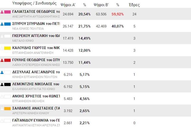 Με ενσωματωμένο το 100% των εκλογικών τμημάτων, ο Θεόδωρος Γαλιατσάτος προηγείται με ποσοστό 59,92% έναντι του 40,07% του Σπυρίδωνα Σπύρου και αναδεικνύεται ο μεγάλος νικητής του ντέρμπι για την Περιφέρεια Ιονίων Νήσων.