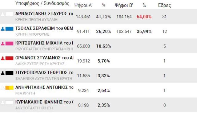 Επανεκλέγεται Περιφερειάρχης Κρήτης ο Σταύρος Αρναουτάκης, ο οποίος, με καταμετρημένο το 100% των εκλογικών τμημάτων, συγκεντρώνει 64% έναντι 35,99% του Σεραφείμ Τσόκα.