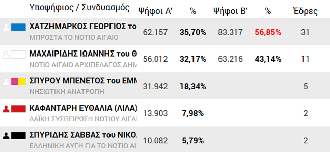 Νίκη στην παράταξη «Μπροστά στο Νότιο Αιγαίο» με επικεφαλής τον Γιώργο Χατζημάρκο, έδωσαν οι ψηφοφόροι του Νοτίου Αιγαίου. Ειδικότερα, ο κ. Χατζημάρκος συγκέντρωσε το 56,85% των ψήφων έναντι του 43,14% του αντιπάλου του Γιάννη Μαχαιρίδη.