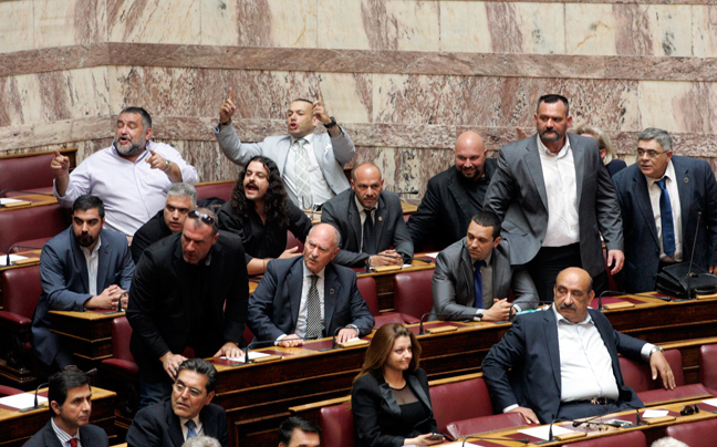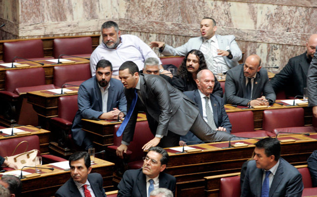 Ακολούθησε πανδαιμόνιο στα έδρανα των χρυσαυγιτών οι οποίοι σηκώθηκαν από τις θέσεις τους και άρχισαν να επιδίδονται σε υβρεολόγια. Ο προφυλακισμένος αρχηγός της Χρυσής Αυγής Νίκος Μιχαλολιάκος φώναζε «σκάσε ρε λιγδιάρη», ενώ οι Μιχάλης Αρβανίτης και Νίκος Μίχος έλεγαν «είστε ξεφτιλισμένοι και καραγκιόζηδες».