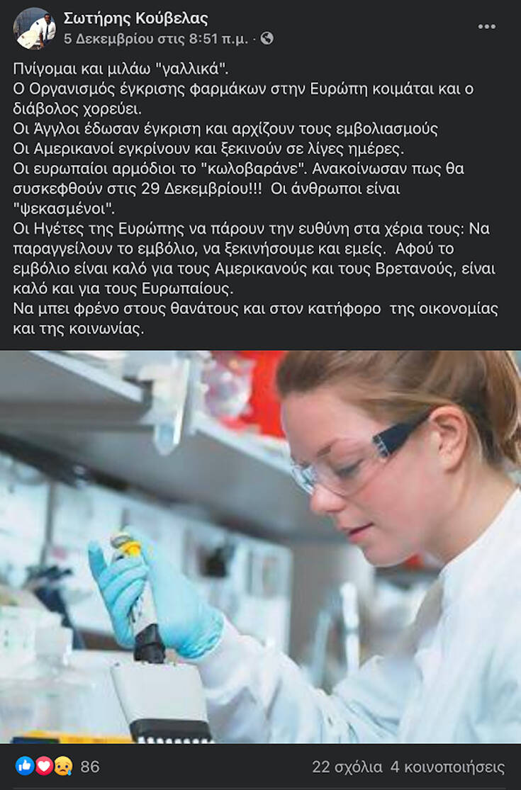 Όπως τονίσει χαρακτηριστικά, «πιστεύω ότι το σοβαρότερο θέμα που θα πρέπει να μας απασχολήσει κατεπειγόντως είναι η επίσπευση έγκρισης και έναρξης των εμβολιασμών. Επειδή ο αρμόδιος οργανισμός της Ευρωπαϊκής Ένωσης καθυστερεί εξοργιστικά και εγκληματικά, αναγκάστηκα να γράψω στο Facebook με αιχμηρή γλώσσα, μήπως και ξυπνήσει κάποιος».