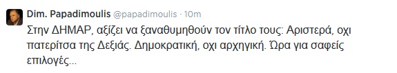 «Στην ΔΗΜΑΡ, αξίζει να ξαναθυμηθούν τον τίτλο τους: Αριστερά, όχι πατερίτσα της Δεξιάς. Δημοκρατική, όχι αρχηγική. Ώρα για σαφείς επιλογές…», έγραψε χαρακτηριστικά ο κ. Παπαδημούλης.