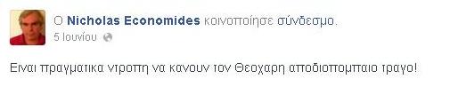 Παράλληλα, σε τελευταία του ανάρτηση σχετικά με την παραίτηση του γενικού γραμματέα Δημοσίων Εσόδων, Χάρη Θεοχάρη, σχολιάζει πως «είναι πραγματικά ντροπή να κάνουν το Θεοχάρη αποδιοπομπαίο τράγο!»