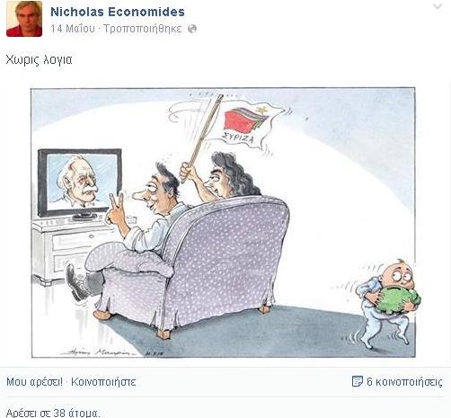 Όσον αφορά το ΣΥΡΙΖΑ, πέρα από τη δημοσίευση γελοιογραφίας με πρωταγωνιστή τον Γλέζο, ο κ. Οικονομίδης σχολιάζει ειρωνικά τις δηλώσεις Γλέζου περί «αναγκαστικού δανεισμού» και σημειώνει πως η αξιωματική αντιπολίτευση «έχει 5 οικονομολόγους με διαφορετικές απόψεις και το Βαρουφάκη με 15 διαφορετικές δικές του. Τώρα έχει και έναν ακόμα “οικονομολόγο” με την 21η άποψη».