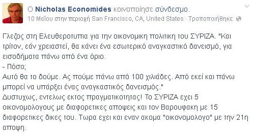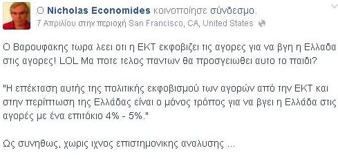 Βέβαια δεν είναι η πρώτη φορά που ο κ. Οικονομίδης ασκεί κριτική κατά του συναδέλφου του κ. Βαρουφάκη, καθώς τον Απρίλιο έγραφε: «Ο Βαρουφάκης τώρα λέει ότι η ΕΚΤ εκφοβίζει τις αγορές για να βγει η Ελλάδα στις αγορές! LOL Μα ποτέ τέλος πάντων θα προσγειωθεί αυτό το παιδί;»