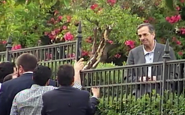 Ο Αντώνης Σαμαράς λίγα λεπτά μετά την ανακοίνωση του ανασχηματισμού της κυβέρνησης, βγήκε, εμφανώς πιο χαλαρός, στον κήπο του Μεγάρου Μαξίμου και είχε σύντομη συνομιλία με τους δημοσιογράφους.