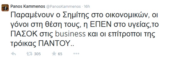 Μέσω Twitter σχολίασε το νέο κυβερνητικό σχήμα ο πρόεδρος των Ανεξάρτητων Ελλήνων, Πάνος Καμμένος, σημειώνοντας πως «παραμένει ο Σημίτης στο Οικονομικών» και «η ΕΠΕΝ στο Υγείας».