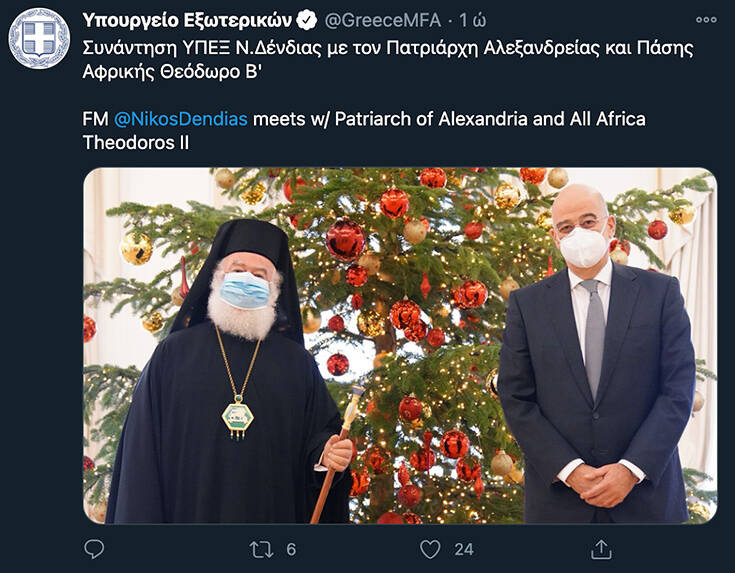 Με τον Πατριάρχη Αλεξανδρείας και πάσης Αφρικής Θεόδωρο Β’ συναντήθηκε σήμερα ο υπουργός Εξωτερικών Νίκος Δένδιας.