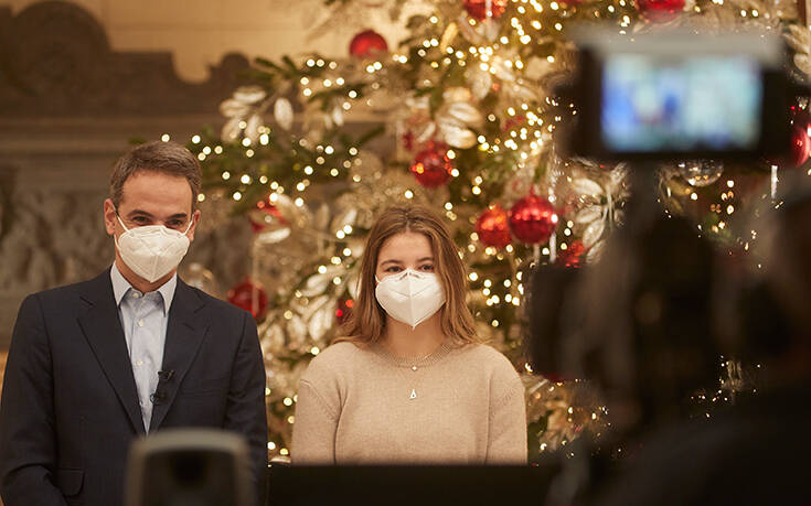 Στη συνέχεια, ο κ. Μητσοτάκης και η κόρη του, Δάφνη, άκουσαν τα κάλαντα από την Ιφιγένεια, τον Γιώργο και τον Παναγιώτη από τα Άγραφα της Ευρυτανίας. «Είμαι εδώ με την κόρη μου, τη Δάφνη, η οποία είχε βρεθεί στο όμορφο χωριό σας πέρυσι τον Ιούλιο. Και εύχομαι με το καλό να τελειώνουμε γρήγορα με τον κορονοϊό για να μπορέσω να έρθω και εγώ να σας επισκεφτώ», ανέφερε ο Κυριάκος Μητσοτάκης ευχαριστώντας τα παιδιά των Αγράφων.