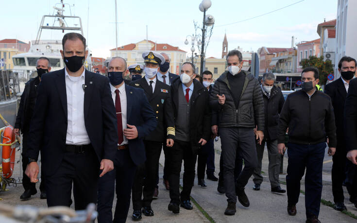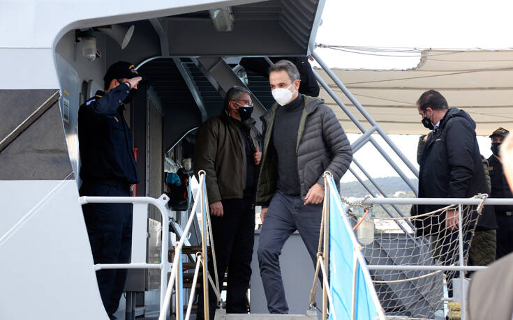 Ο Κυριάκος Μητσοτάκης ανέβηκε στα σκάφη του Λιμενικού που βρίσκονταν στο λιμάνι της Μυτιλήνης, συνοδευόμενος από τον Αρχηγό του Σώματος Θεόδωρο Κλιάρη.