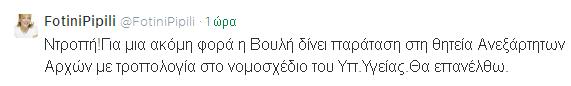 Τη δυσαρέσκειά της για τον τρόπο με τον οποίο πέρασε από την Βουλή η παράταση της θητείας των Ανεξάρτητων Αρχών εκφράζει η Φωτεινή Πιπιλή με μήνυμα στον προσωπικό της λογαριασμό στο Twitter.