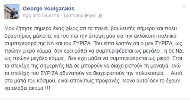 «Μου ζήτησε σήμερα ένας φίλος απ τα παλιά, βουλευτής σήμερα και πολύ δραστήριος μάλιστα, να του πω την άποψη μου για την αλλόκοτη-πολιτικά συμπεριφορά της ΝΔ και του ΣΥΡΙΖΑ. Του είπα λοιπόν, ότι ο μεν ΣΥΡΙΖΑ, ως πρώην μικρό κόμμα, δεν έχει μάθει να συμπεριφέρεται ως μεγάλο , η δε ΝΔ, ως πρώην μεγάλο κόμμα , δεν έχει μάθει να συμπεριφέρεται ως μικρό» γράφει στο Facebook ο κ. Βουλγαράκης.
