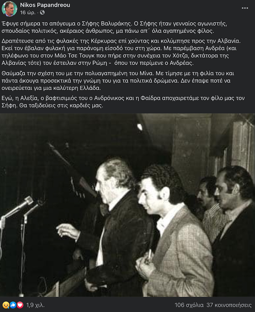 Με βαθιά συγκίνηση αποχαιρέτησε ο συγγραφέας Νίκος Παπανδρέου, γιος του ιδρυτή του ΠΑΣΟΚ, τον πρώην υπουργό Σήφη Βαλυράκη που βρέθηκε χθες νεκρός στα νερά του Ευβοϊκού κόλπου. Όπως γράφει χαρακτηριστικά στον προσωπικό λογαριασμό που διατηρεί στο Facebook, «ο Σήφης ήταν γενναίος αγωνιστής, σπουδαίος πολιτικός, ακέραιος άνθρωπος, μα πάνω απ΄ όλα αγαπημένος φίλος.