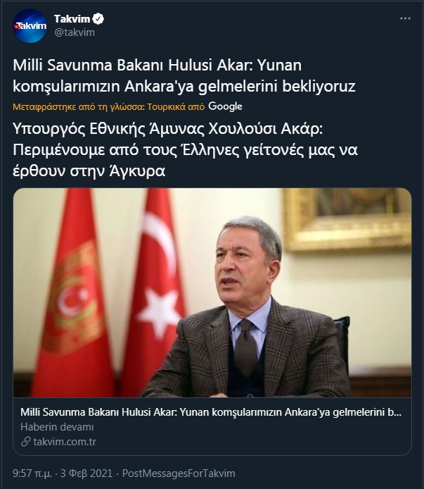 Ο υπουργός Άμυνας της Τουρκίας, Χουλουσί Ακάρ, ανέφερε το πρωί της Τετάρτης πως η Τουρκία «περιμένει τους Έλληνες γείτονές της στην Άγκυρα, για να χτίσουμε σχέσεις εμπιστοσύνης».