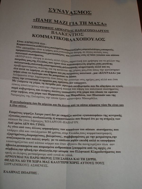 ΠΟΛΙΤΙΚΗ Συνδυασμός: «Πάμε μαζί για τη μάσα» Δείτε τι έριξε στην κάλπη συμπολίτης μας 08·11·2010 11:21 1 σχόλια