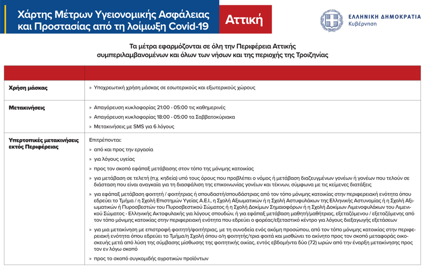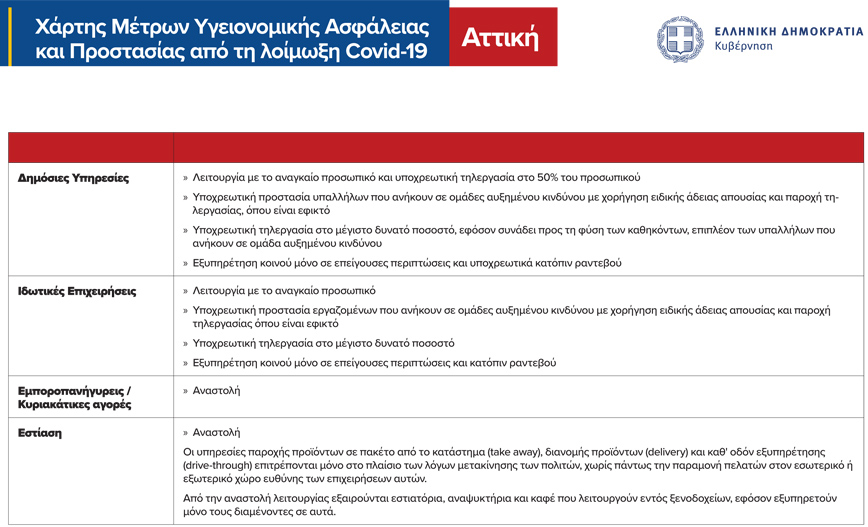 –Μεταφορές: Θα διενεργούνται με 65% πληρότητα στα Μέσα Μαζικής Μεταφοράς και 50% πληρότητα στα πλοία (55% εφόσον διαθέτουν καμπίνες). Στα ΙΧ και τα ταξί επιτρέπεται οδηγός και δύο επιβάτες (εξαιρουμένων ανηλίκων τέκνων και ατόμων που χρήζουν βοήθειας).