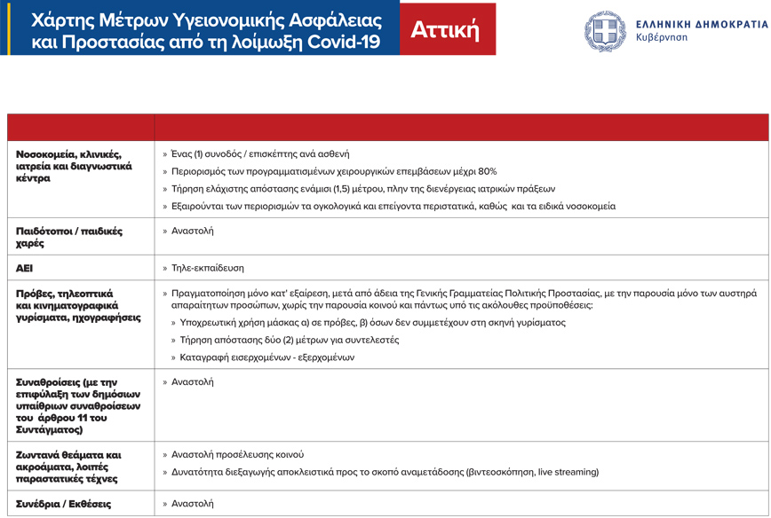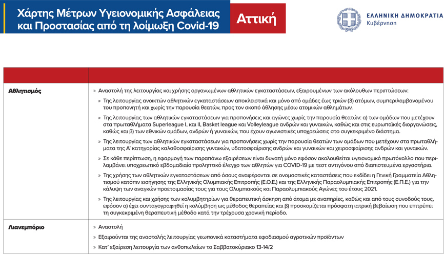 –Αθλητικές δραστηριότητες: Εξακολουθούν να ισχύουν τα υφιστάμενα μέτρα. Ενώ δεν υπάρχει κάποια διαφοροποίηση στα μέτρα που ισχύουν για τους αρχαιολογικούς χώρους, τις κινηματογραφικές προβολές, τα ζωντανά θεάματα και ακροάματα και τις λοιπές παραστατικές τέχνες, τα συνέδρια και τις εκθέσεις, καθώς και τις πρόβες και τα τηλεοπτικά και κινηματογραφικά γυρίσματα και ηχογραφήσεις.