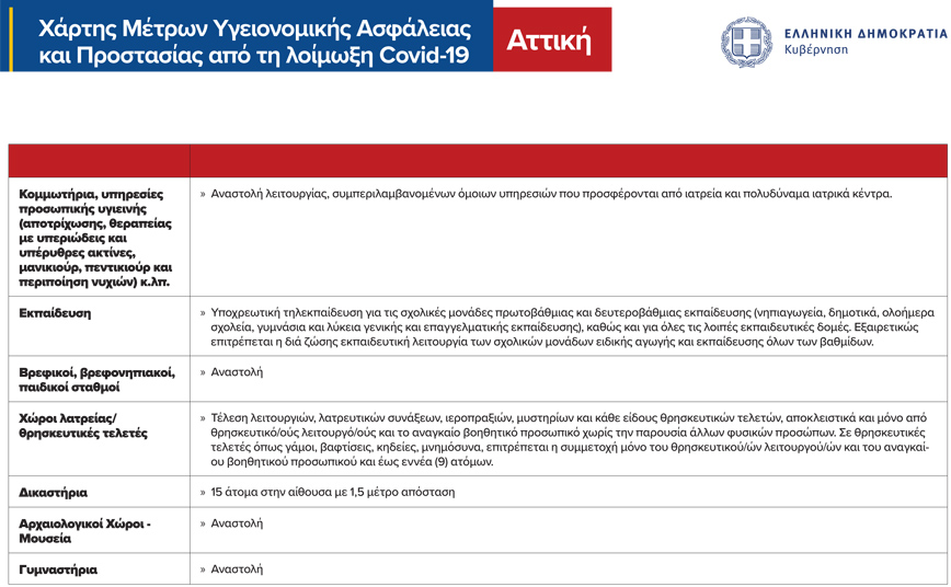 –Χώροι λατρείας: Η τέλεση λειτουργιών, λατρευτικών συνάξεων, ιεροπραξιών, μυστηρίων και κάθε είδους θρησκευτικών τελετών, γίνεται από θρησκευτικούς λειτουργούς και το αναγκαίο βοηθητικό προσωπικό χωρίς την παρουσία άλλων φυσικών προσώπων. Σε θρησκευτικές τελετές όπως γάμοι, βαφτίσεις, κηδείες, μνημόσυνα, επιτρέπεται η συμμετοχή μόνο του θρησκευτικού λειτουργού, του αναγκαίου βοηθητικού προσωπικού και έως εννέα (9) ατόμων.