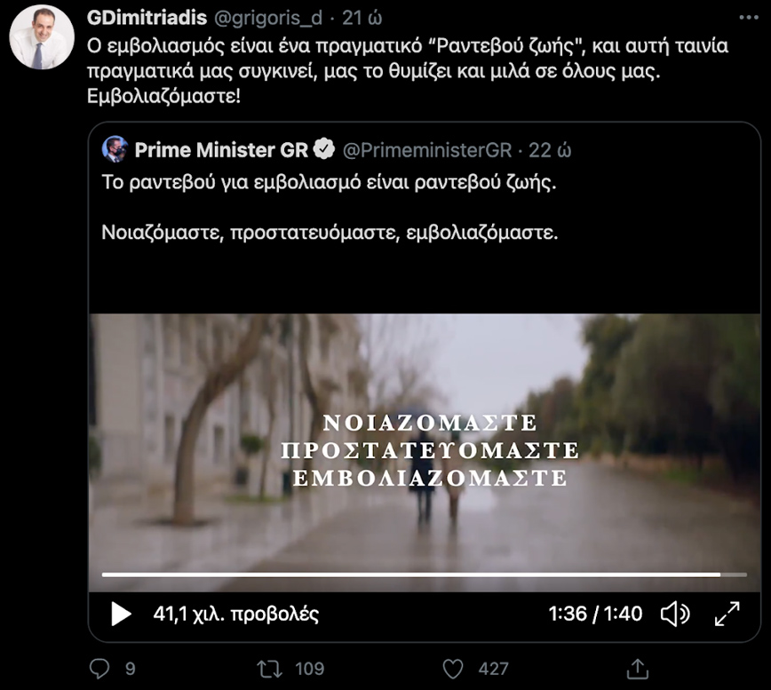 Ο στενός συνεργάτης του Κυριάκου Μητσοτάκη ανάρτησε το νέο σχετικό τηλεοπτικό σποτ, με πρωταγωνιστές τον… Αντωνάκη και την Ελενίτσα, που υποδύονται οι γνωστοί ηθοποιοί Γιώργος Κωνσταντίνου και Μάρω Κοντού, οι οποίοι εμμέσως πλην σαφώς καλούν τον πληθυσμό και ιδίως τους ηλικιωμένους να κάνουν το εμβόλιο κατά του κορονοϊού.