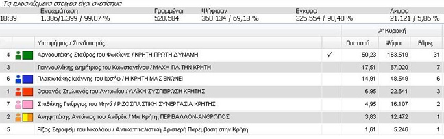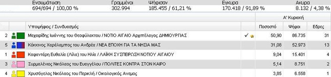 Έκλεισαν, σύμφωνα με τα επίσημα στοιχεία, οι δύο περιφέρειες, της Κρήτης και του Νοτίου Αιγαίου στο ΠΑΣΟΚ χωρίς να χρειαστεί οι εκλογείς να προσέλθουν ξανά στις κάλπες.