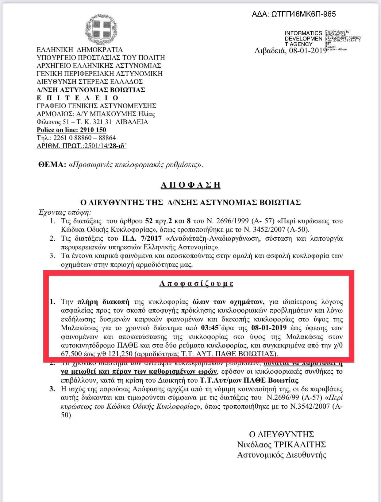 Του επισυνάπτουμε λοιπόν την απόφαση της 8-1-2019 για προληπτικό κλείσιμο της Εθνικής Οδού, επί δικής του πρωθυπουργίας. Πιθανόν τότε να μην το είχε αντιληφθεί, όπως και πολλά άλλα. Δύο χρόνια μετά προφανώς κάποιος από τους συνεργάτες του θα του το είπε. Αλλά εκείνος επιμένει να το λέει ψευδόμενος διαρκώς και να αυτοεξευτελίζεται».