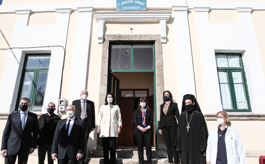 Τελευταίος σταθμός της κ. Σακελλαροπούλου ήταν η Ερεικούσα, όπου πρώτα επισκέφθηκε το εμβολιαστικό κέντρο του νησιού και αμέσως μετά μετέβη στο δημοτικό σχολείο, όπου την περίμεναν οι μοναδικοί τρεις μαθητές του και η δασκάλα τους.