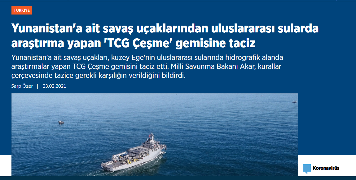 «Τέσσερα F-16 που ανήκουν στην ελληνική Πολεμική Αεροπορία παρενόχλησαν το πλοίο «Τσεσμέ», που πραγματοποιεί επιστημονικές και τεχνικές έρευνες σε διεθνή ύδατα στον Βόρειο Αιγαίο», αναφέρει χαρακτηριστικά το Anadolu.