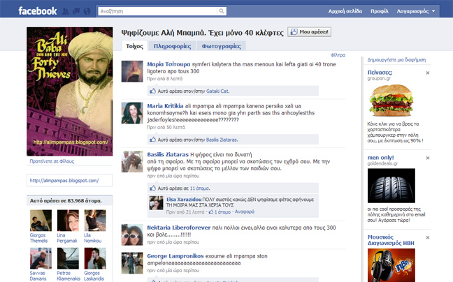 Οι χρήστες του facebook διαθέτουν χιούμορ. Δεν θα μπορούσαν λοιπόν να μην σατιρίσουν τις αυτοδιοικητικές εκλογές. Μάλιστα, την εν λόγω σελίδα «ψήφισαν» 83.973 άτομα…