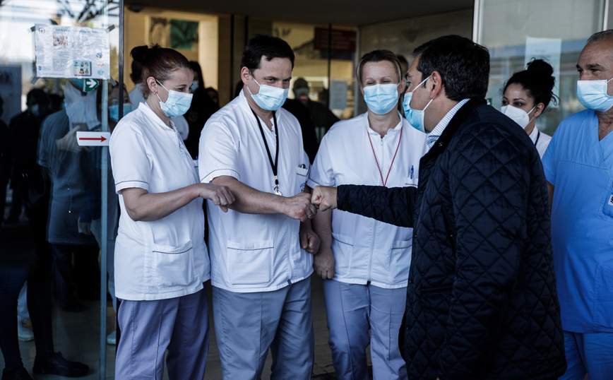 Ο κ. Τσίπρας σημείωσε ότι «οι ελλείψεις σε νοσηλευτικό και ιατρικό προσωπικό είναι γνωστές, όπως γνωστή σε όλους είναι και η ηρωική προσπάθεια που κάνουν αυτοί οι άνθρωποι να κρατήσουν όρθιο το σύστημα». «Η κυβέρνηση όμως», είπε, «όχι μόνο δεν έχει φροντίσει να καλυφθούν οι μεγάλες ελλείψεις που υπάρχουν, αλλά ούτε έχει δώσει και μια ηθική στήριξη, μια ηθική ανταμοιβή και αναγνώριση αυτής της προσπάθειας».