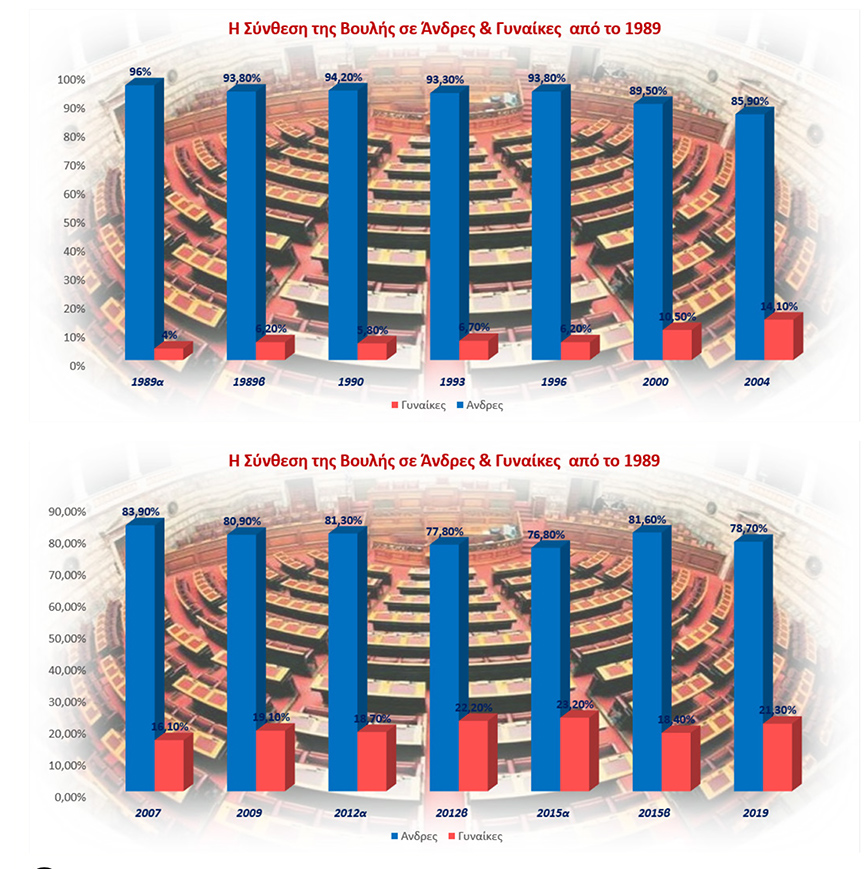 Παρατηρώντας κανείς τη σύνθεση του ελληνικού Κοινοβουλίου σε βάθος χρόνου, διαπιστώνει ότι η εκπροσώπηση των γυναικών παραμένει σε χαμηλό ποσοστό.