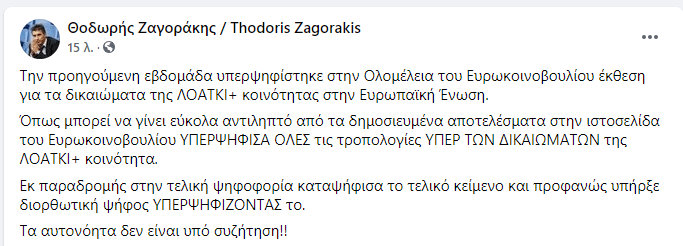 Την στήριξή του στη ΛΟΑΤΚΙ κοινότητα εξέφρασε ο Θοδωρής Ζαγοράκης, εξηγώντας ότι εκ παραδρομής καταψήφισε στο Ευρωκοινοβούλιο το τελικό κείμενο για τα δικαιώματά τους.