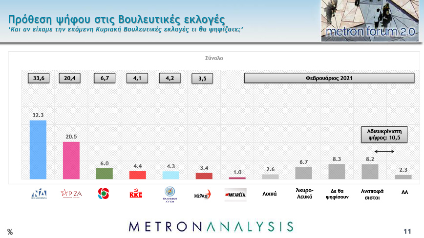 «Και αν είχαμε την επόμενη Κυριακή Βουλευτικές εκλογές τι θα ψηφίζατε;» ρωτήθηκαν οι πολίτες και το 32,3% απάντησε Νέα Δημοκρατία σε αντίθεση με το 20,5% που απάντησε ΣΥΡΙΖΑ. Το 6% απάντησε ΚΙΝΑΛ, το 4,4% ΚΚΕ, το 4,3% Ελληνική Λύση, το 3,4 ΜέΡΑ25 και το 1% ΑΝΤΑΡΣΥΑ.
