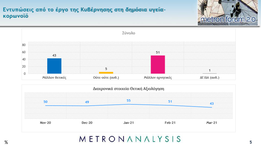 Μάλλον αρνητικές, σε ποσοστό 51% είναι οι εντυπώσεις των πολιτών από το έργο της Κυβέρνησης στη δημόσια υγεία και τη διαχείριση του κορονοϊού σε αντίθεση με το 43% που είναι μάλλον θετικές.