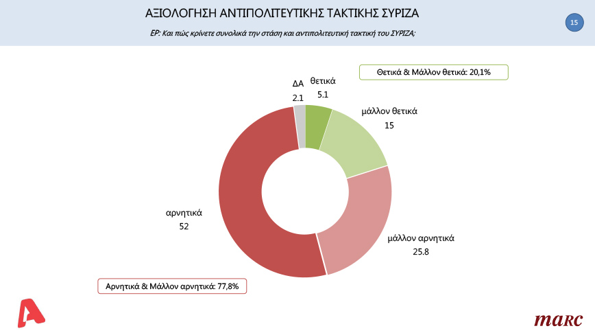 «Πώς κρίνετε συνολικά την στάση και αντιπολιτευτική τακτική του ΣΥΡΙΖΑ;» ήταν η επόμενη ερώτηση που δέχθηκαν οι πολίτες και σε ποσοστό 77,8% απάντησαν αρνητικά ή μάλλον αρνητικά ενώ το 20,1% απάντησε θετικά ή μάλλον θετικά.