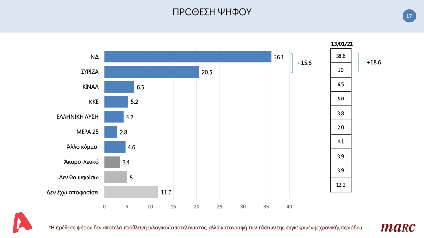 Η διαφορά ανάμεσα σε Νέα Δημοκρατία και ΣΥΡΙΖΑ διαμορφώνεται στο 15,6% καθώς το 36,1% των πολιτών θα ψήφιζε Νέα Δημοκρατία ενώ το 20,5% ΣΥΡΙΖΑ αν είχαμε εκλογές την ερχόμενη Κυριακή.