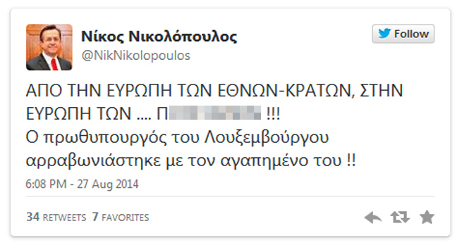 Στην αντίληψη του πρωθυπουργού του Λουξεμβούργου έπεσε ένα -όχι και τόσο κολακευτικό για τον ίδιο- σχόλιο του προέδρου του Χριστιανοδημοκρατικού Κόμματος και βουλευτή Αχαΐας, Νίκου Νικολόπουλου, αναφορικά με τις σεξουαλικές προτιμήσεις του πρώτου.