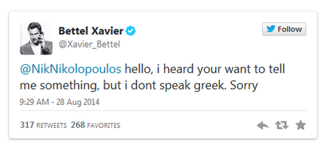 Προφανώς ο πρωθυπουργός του Λουξεμβούργου, ο οποίος δεν μιλάει ελληνικά, ενημερώθηκε για το περιεχόμενο του σχολίου και έσπευσε να απαντήσει, με μάλλον ειρωνικό ύφος: «Γεια, άκουσα ότι θέλετε κάτι να μου πείτε, αλλά δε μιλάω ελληνικά. Λυπάμαι».