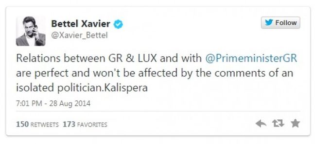 «Οι σχέσεις μεταξύ της Ελλάδας και του Λουξεμβούργου και η σχέση μου με τον φίλο μου τον Αντώνη Σαμαρά είναι τέλειες, και δεν θα επηρεαστούν από τα σχόλια ενός απομονωμένου πολιτικό».