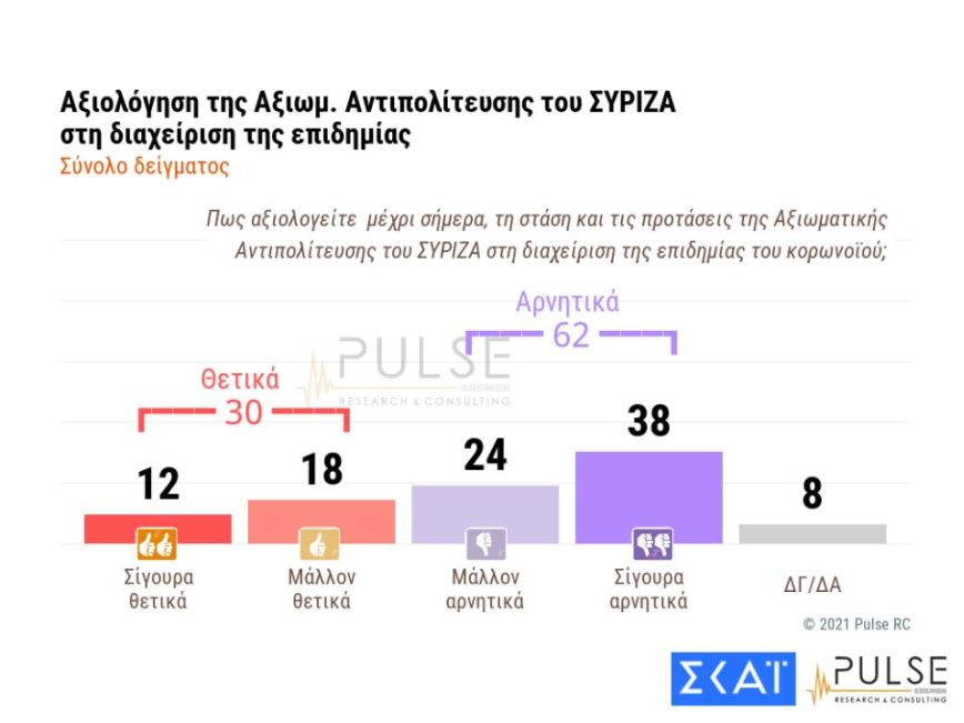 Οι πολίτες κλήθηκαν να σχολιάσουν και την αξιωματική αντιπολίτευση στο ίδιο θέμα. «Πώς αξιολογείτε μέχρι σήμερα, την στάση και τις προτάσεις της Αξιωματικής Αντιπολίτευσης του ΣΥΡΙΖΑ στη διαχείριση της επιδημίας του κορονοϊού;» ρωτήθηκαν οι πολίτες και το 30% απάντησε θετικά σε αντίθεση με το 62% που απάντησε αρνητικά.