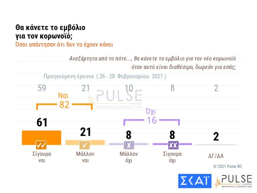 Θετικά «βλέπουν» οι πολίτες το εμβόλιο του κορονοϊού καθώς το 82% απάντησε πως θα το κάνει σε αντίθεση με το 16% που απάντησε αρνητικά.