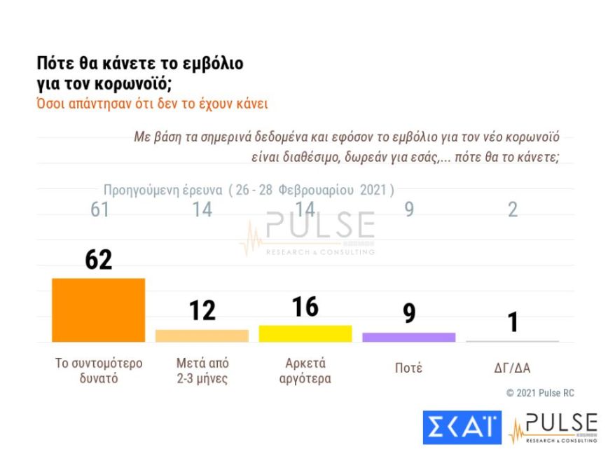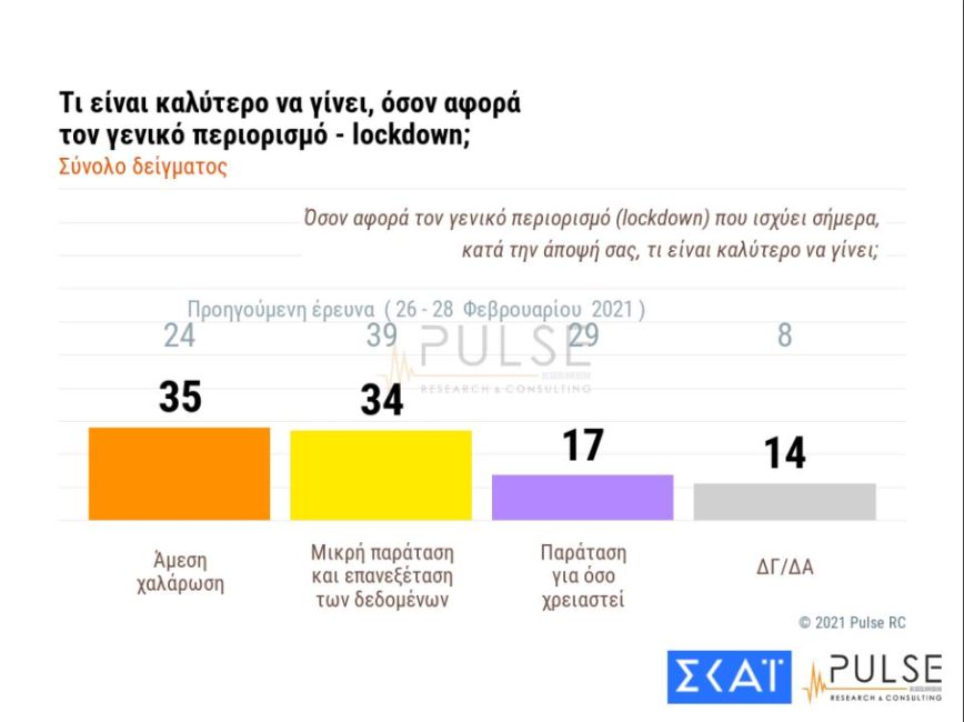 Δημοσκόπηση για λογαριασμό του σταθμού ΣΚΑΪ πραγματοποίησε η εταιρεία Pulse. Η δημοσκόπηση πραγματοποιήθηκε σε δείγμα 1.306 ατόμων από τις 26 έως τις 28 Μαρτίου.