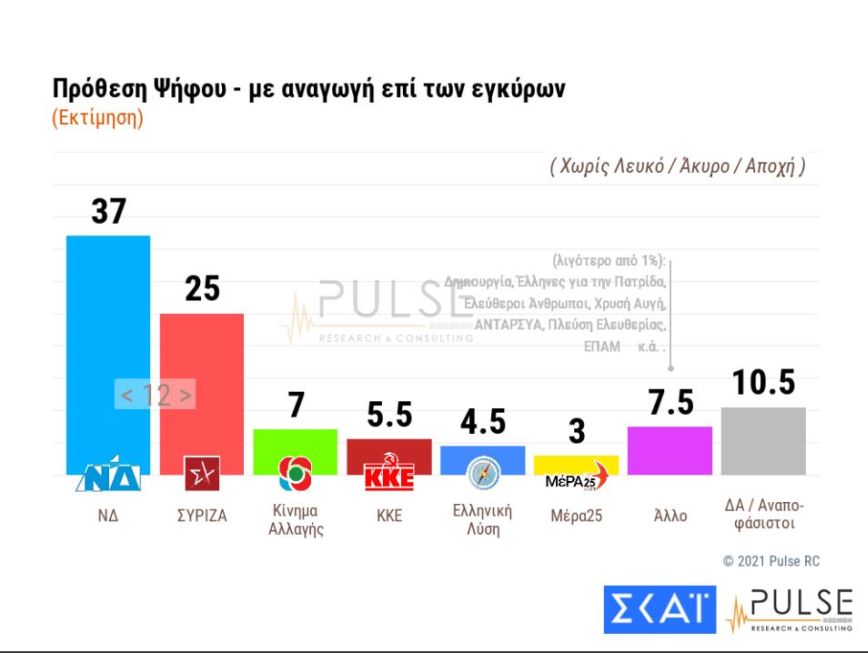 Συγκεκριμένα, το 37% των πολιτών απάντησαν πως θα ψήφιζαν Νέα Δημοκρατία αν είχαμε εκλογές την ερχόμενη Κυριακή, το 25% ΣΥΡΙΖΑ, το 7% Κίνημα Αλλαγής, το 5,5% ΚΚΕ, το 4,5% Ελληνική Λύση, το 3% ΜεΡΑ 25, το7,5% κάποιο άλλο κόμμα και το 10,5% είναι οι αναποφάσιστοι.