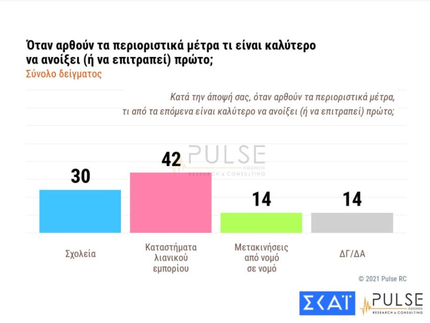 «Όταν αρθούν τα περιοριστικά μέτρα τι είναι καλύτερο να ανοίξει πρώτο;» ήταν η επόμενη ερώτηση και το 42% απάντησε τα καταστήματα λιανικού εμπορίου, το 30% τα σχολεία και το 14% οι μετακινήσεις από νομό σε νομό.