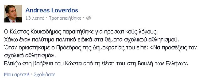 Μέσω facebook σχολίασε ο υπουργός Παιδείας Ανδρέας Λοβέρδος την παραίτηση του υφυπουργού Παιδείας Κώστα Κουκοδήμου.