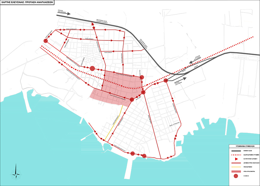 Λαμβάνοντας υπόψη την ανάγκη αναδιοργάνωσης του αστικού χώρου της Ελευσίνας μέσα από ένα συνδυασμένο κυκλοφοριακό και πολεοδομικό σχεδιασμό που θα αναδείξει τα ποιοτικά χαρακτηριστικά της ως «πολιτιστική πρωτεύουσα Ευρώπης 2021», προτείνονται παρεμβάσεις που αφορούν στη α) δημιουργία ασφαλούς οδικού περιβάλλοντος, στη β) δημιουργία ολοκληρωμένου, συνεκτικού και συνεχούς δικτύου κίνησης πεζών, γ) σε μονοδρομήσεις και δ) στην υλοποίηση ενός ολοκληρωμένου δικτύου κίνησης ποδηλάτου.