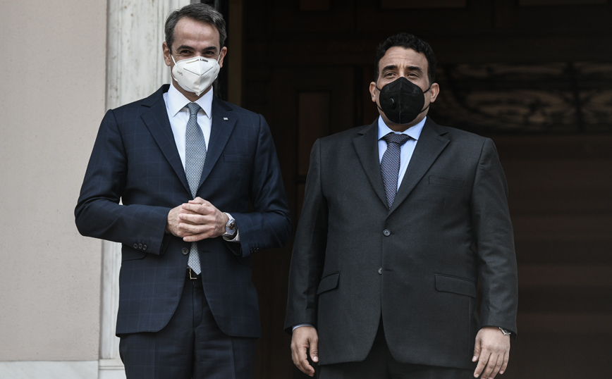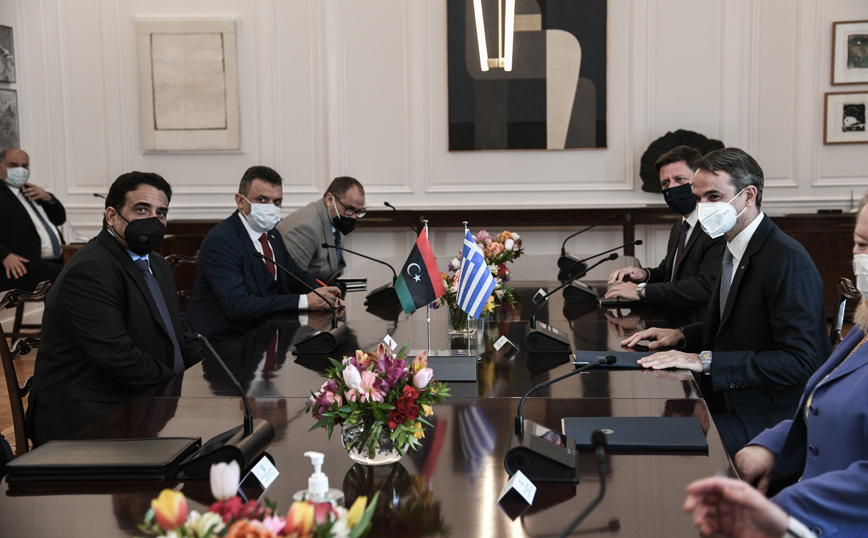 Ο κ. Μητσοτάκης χαιρέτισε την πρόθεση του προέδρου της Λιβύης αλλά και του πρωθυπουργού «να συζητήσει η Λιβύη με την Ελλάδα κρίσιμα ζητήματα όπως η οριοθέτηση των θαλασσίων ζωνών». Διαβεβαίωσε ότι η χωρα μας είναι φίλη χώρα προς τη Λιβύη, ο ελληνικός λαός είναι φίλος λαός της Λιβύης, και όπως είπε οι σχέσεις των δύο χωρών χάνονται στα βάθη των αιώνων.