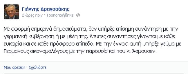 Επιβεβαίωσε ο υπεύθυνος του οικονομικού προγράμματος του ΣΥΡΙΖΑ Γιάννης Δραγασάκης τη συνάντηση στο Βερολίνο με τον Γεργκ Άσμουσεν, πρώην εκτελεστικό σύμβουλο της ΕΚΤ και νυν υφυπουργό Εργασίας της κυβέρνησης Μέρκελ.