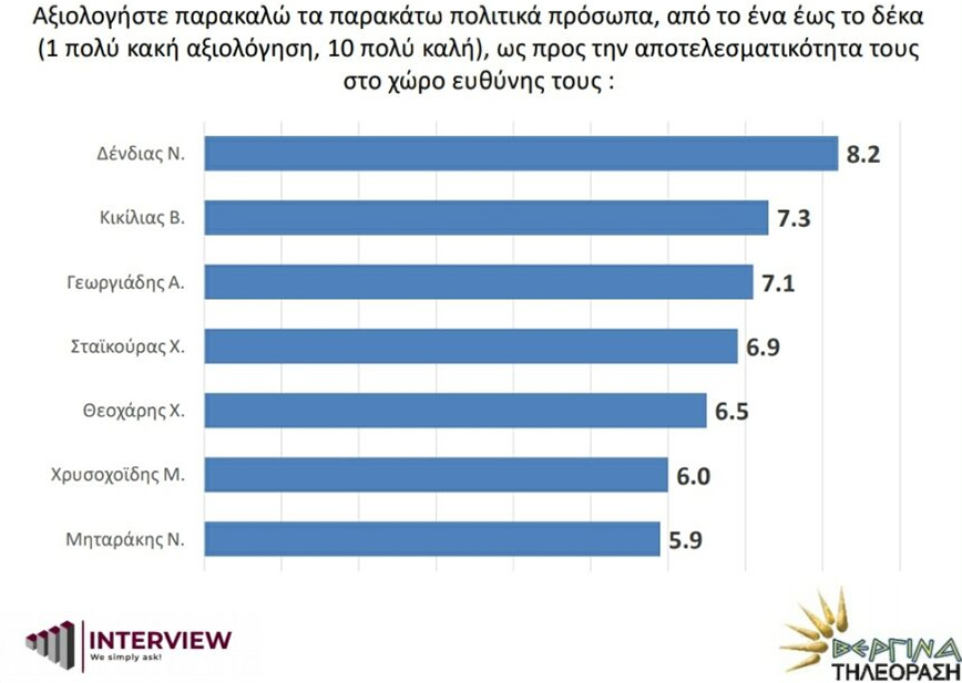 Σύμφωνα με τις αξιολογήσεις των πολιτών πρώτος έρχεται ο υπουργός Εξωτερικών όσον αφορά στην αποτελεσματικότητά του (8,2%). Ακολουθεί στη δεύτερη θέση ο Βασίλης Κικίλιας (7,3%), ενώ τρίτος αναδεικνύεται ο Άδωνις Γεωργιάδης (7,1%). Ακολουθούν ο Χ. Σταϊκύρας (6,9%), ο Χ. Θεοχάρης (6,5%), με τελευταίους το Μιχάλη Χρυσοχοϊδη (6%) και το Νότη Μηταράκη (5,9%)